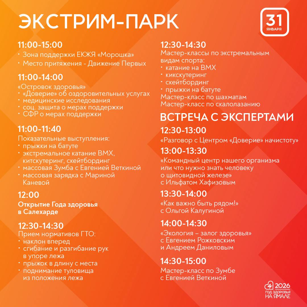 Афиша открытия в Салехарде Года здоровья настолько обширна, что мы едва уместили ее в двух карточках. Смотрите, выбирайте и приходите! А иначе где вы эмоциональным интеллектом займетесь или "правило тарелки" освоите? А показательные выступления экстрим-спортсменов уж точно пропустить нельзя!