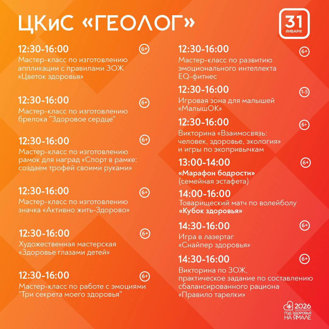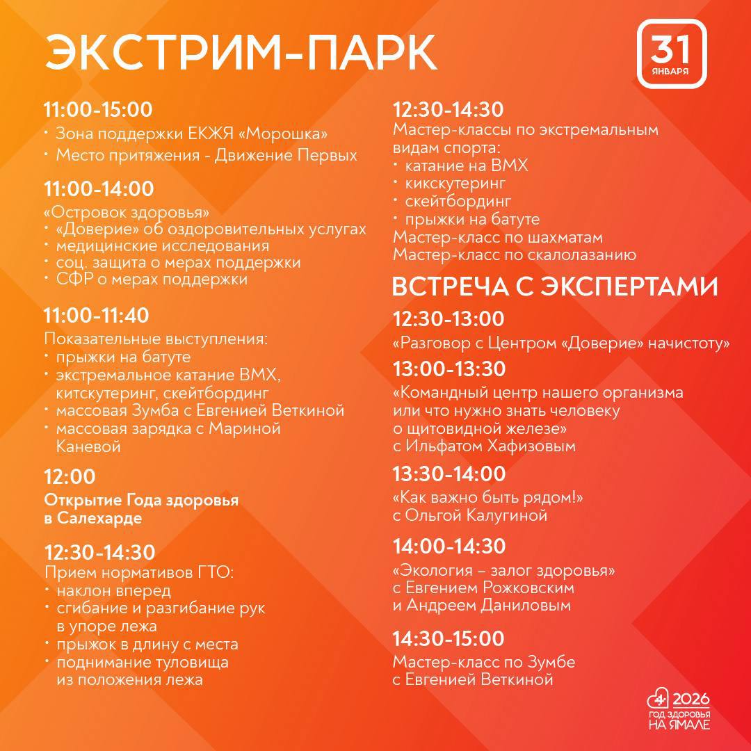 Открытие Года здоровья в Салехарде будет ярким и насыщенным. В программе мастерклассы для детей и взрослых, активности про эмоциональный интеллект, игровые и спортивные площадки, семейные форматы и полезные встречи.