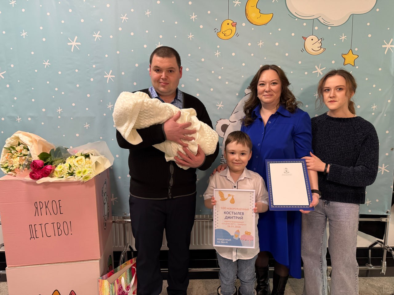 В Ноябрьске появился на свет сотый ребенок с начала 2026 года. Он родился в семье Павла и Елены Костылевых 25 января. Мальчик стал четвертым ребенком в семье у него есть старшие брат и две сестры.