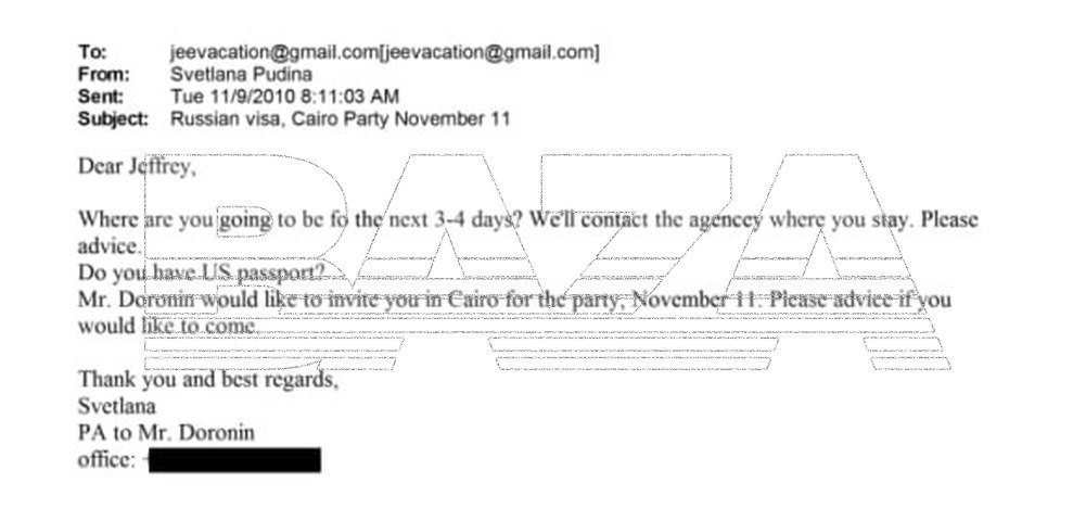 Помимо этого, Эпштейн неоднократно пытался ускорить получение российской визы — в конце 2010 и начале 2011 годов. Сначала помощники Доронина предложили обратиться в агентство в Лондоне, но даже после этого быстро оформить визу не удалось. Кроме того, по просьбе Наоми Кэмпбелл помощники Доронина предлагали Эпштейну апартаменты, построенные российским бизнесменом в центре Москвы.