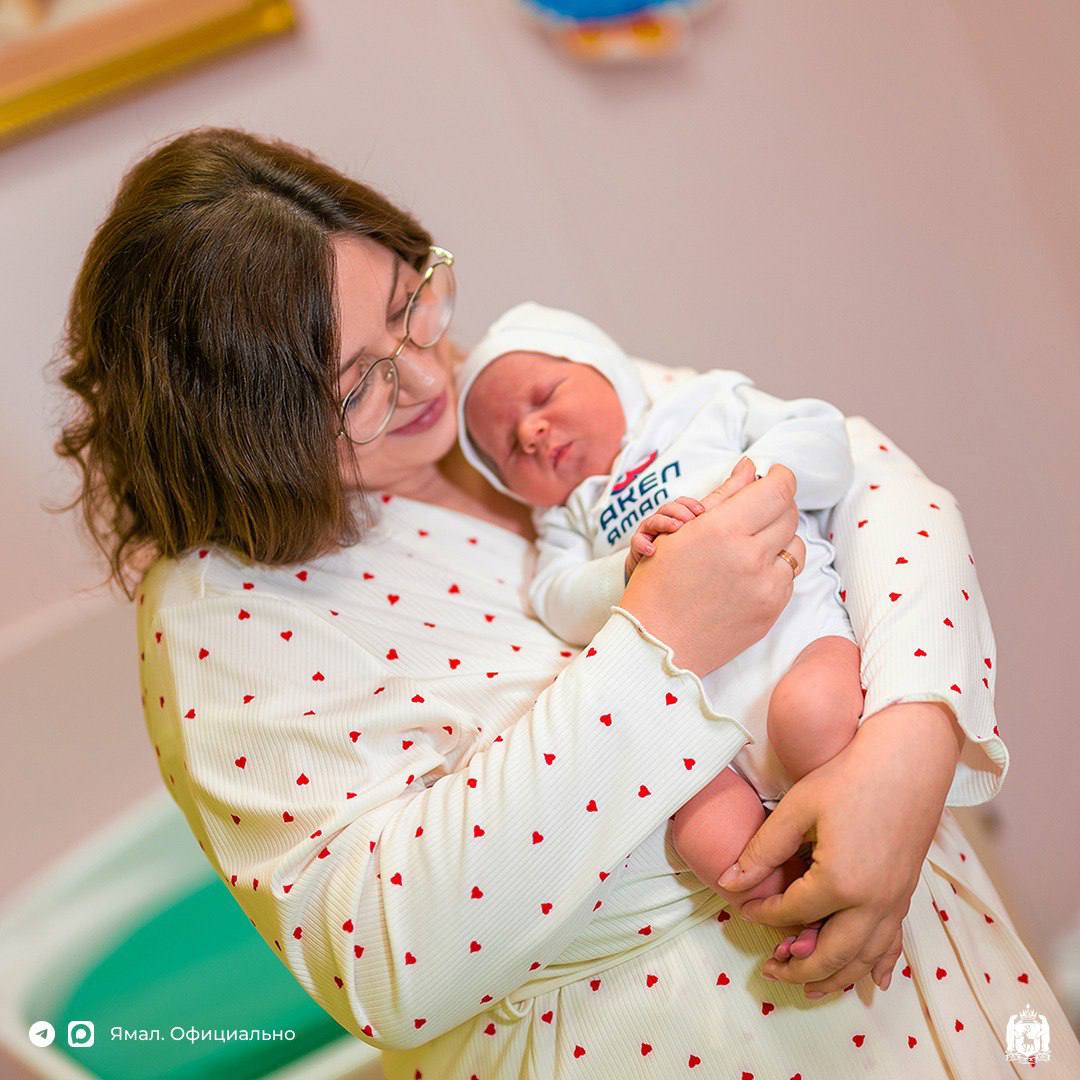 Первый обладатель подарка от «ФАКЕЛА» – Савелий из Салехарда. Настоящий богатырь весом более четырёх килограммов родился 1 февраля и сегодня вместе с мамой в сопровождении родных отправился домой примерять обновки