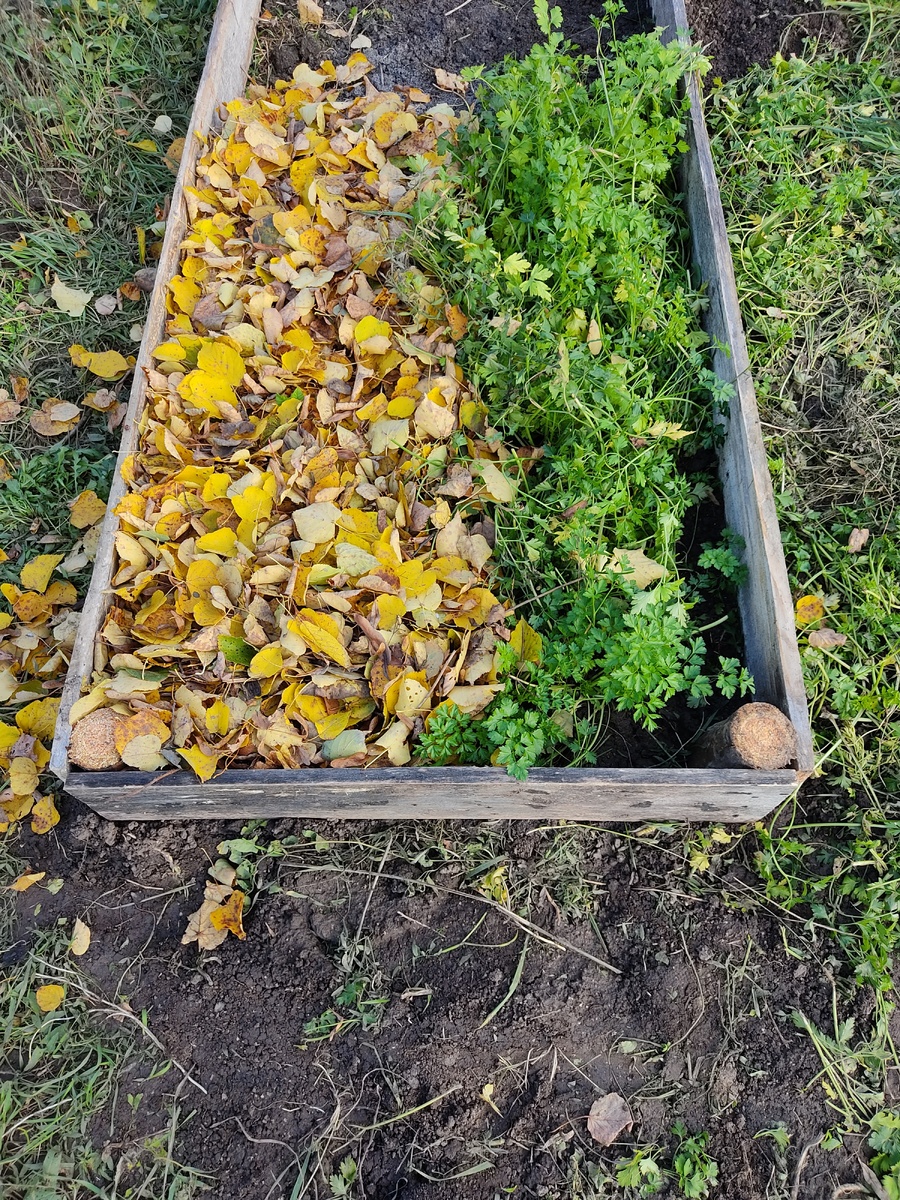 Кстати, остатки чеснока были высажены на соседней грядке, рядом с петрушкой, и также замульчированы. В результате получилась невероятно привлекательная композиция: яркая зелень и золотая листвы создают гармоничное настроение в саду!