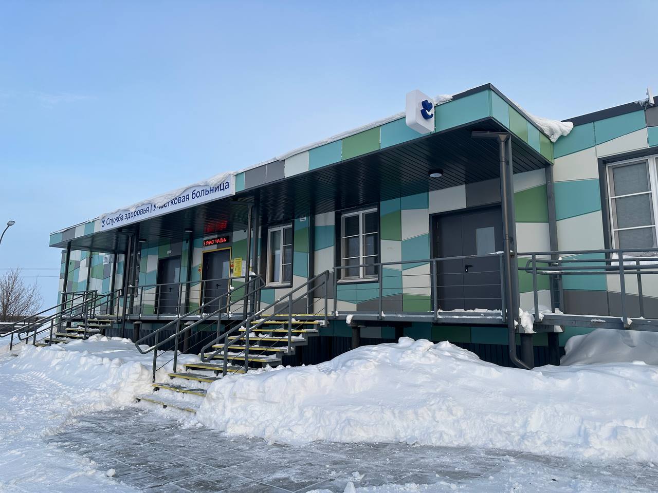 Модульное здание площадью 1500 м включает поликлинику на 15 посещений в смену и стационар на 7 коек круглосуточно + 6 коек дневного пребывания.