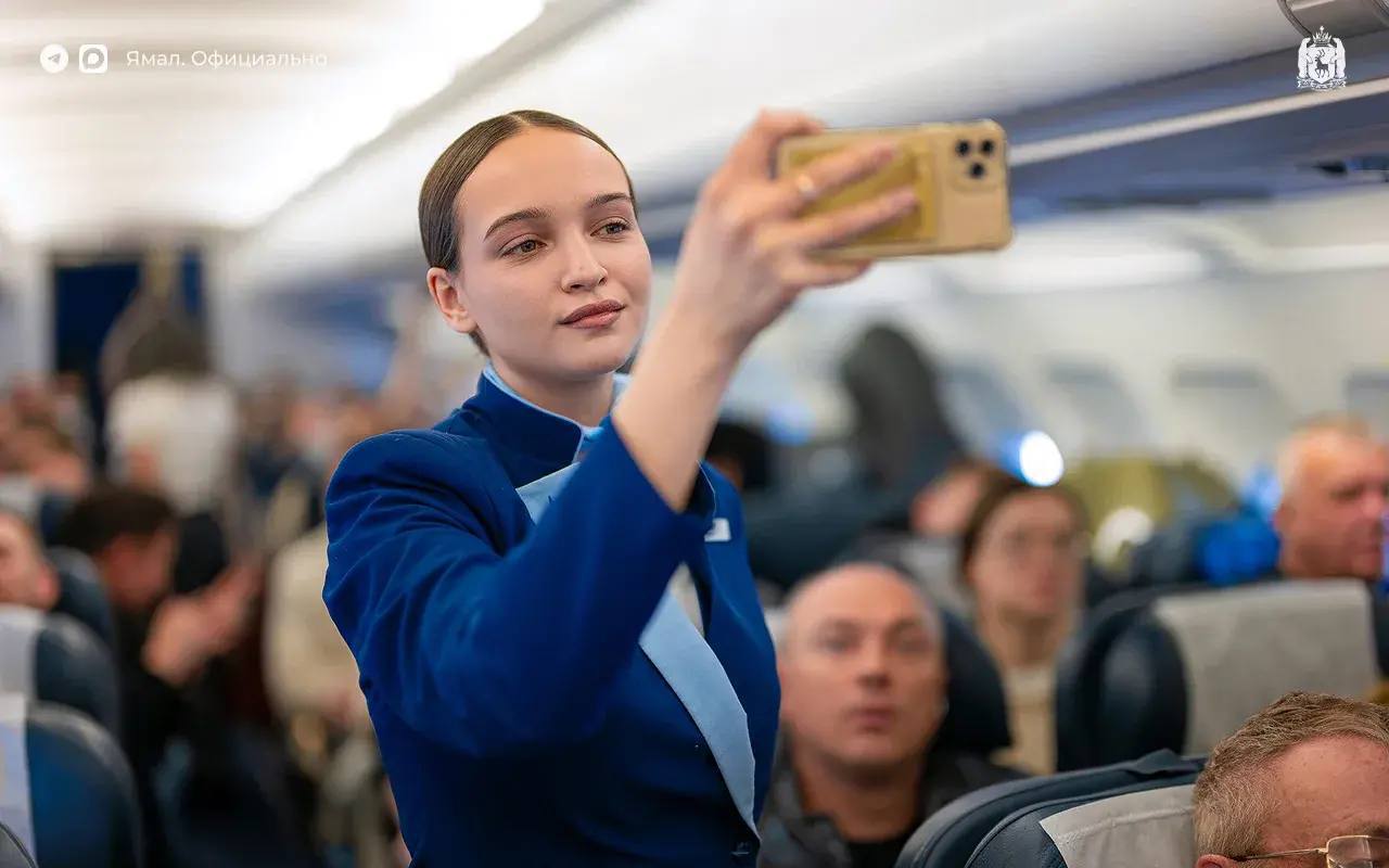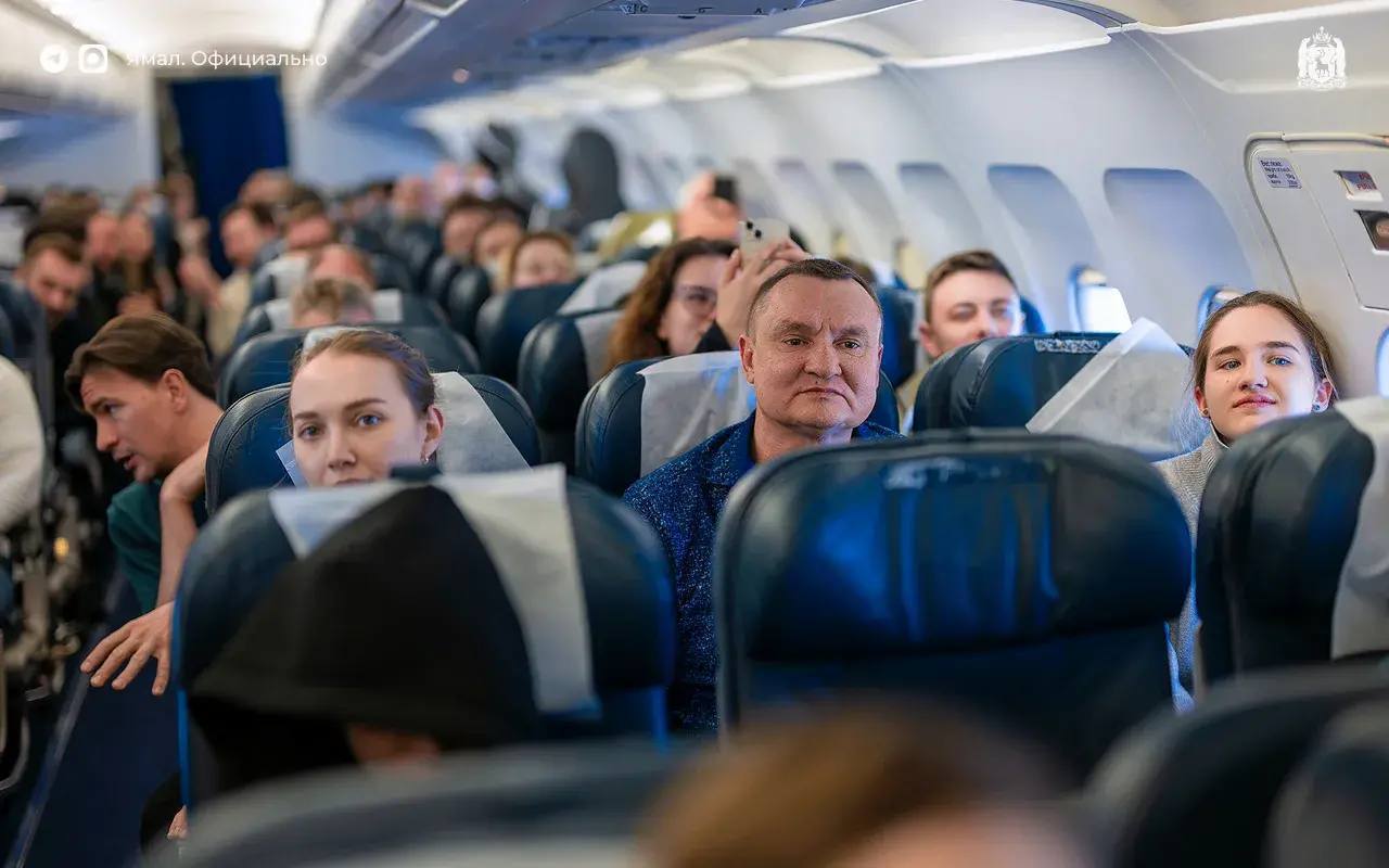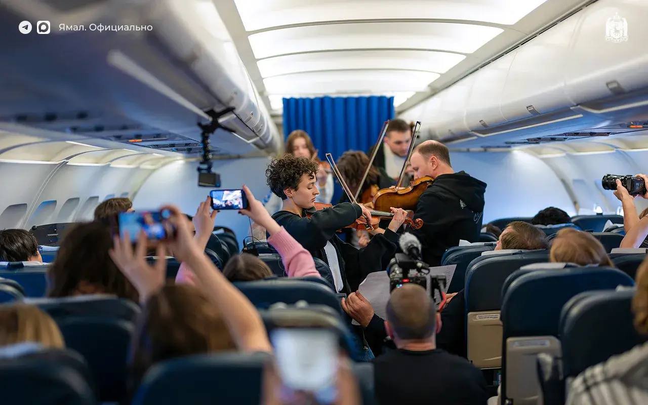 Всё потому, что его пассажирами оказались участники «Симфонии Ямала». Прямо во время полёта Стефания Поспехина и артисты Московского государственного академического симфонического оркестра исполнили композицию «Радость любви».