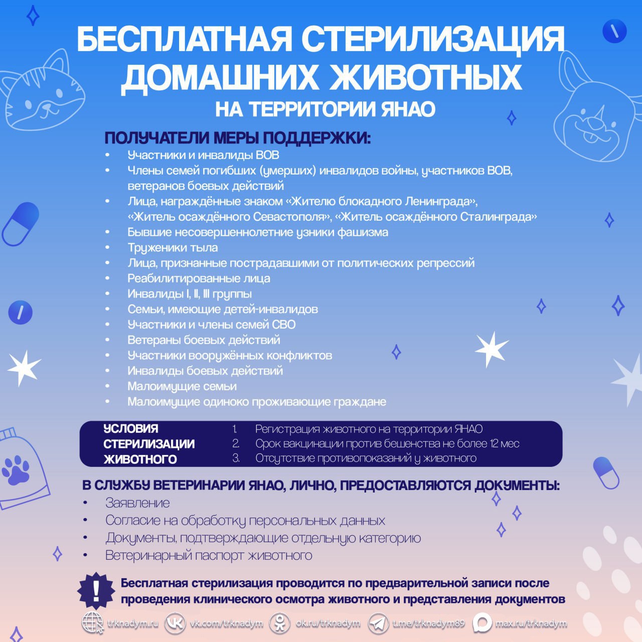 Право на стерилизацию двух домашних животных (собак, кошек) в течение года имеют льготные категории граждан.