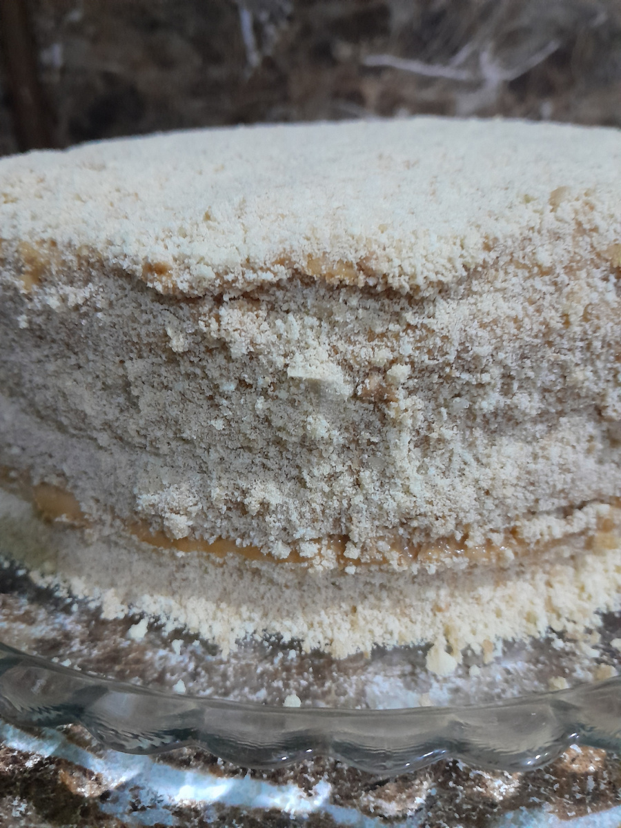 3. Измельчите обрезки коржей в крошку и щедро ими посыпьте торт, придавая ему характерный вид медовика.