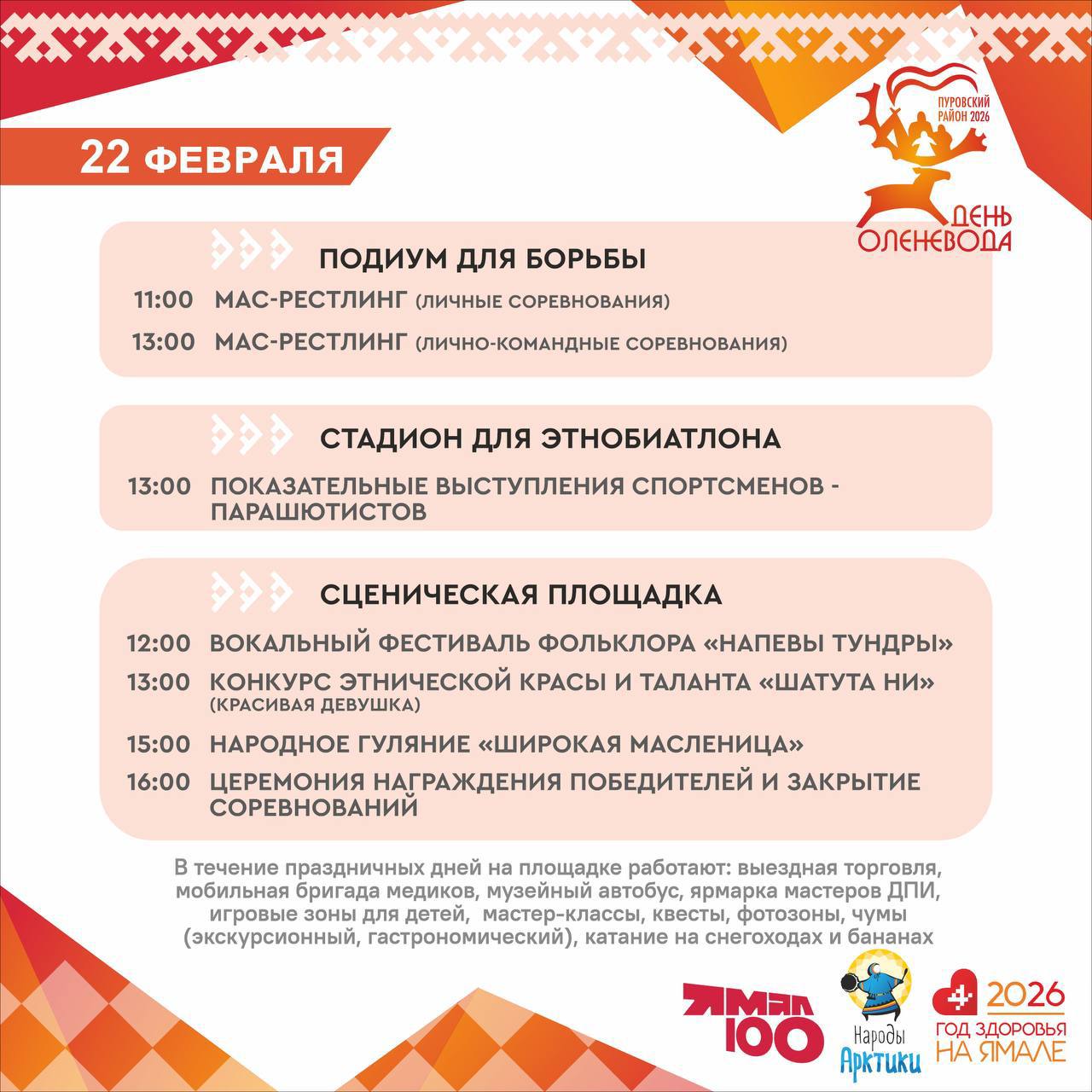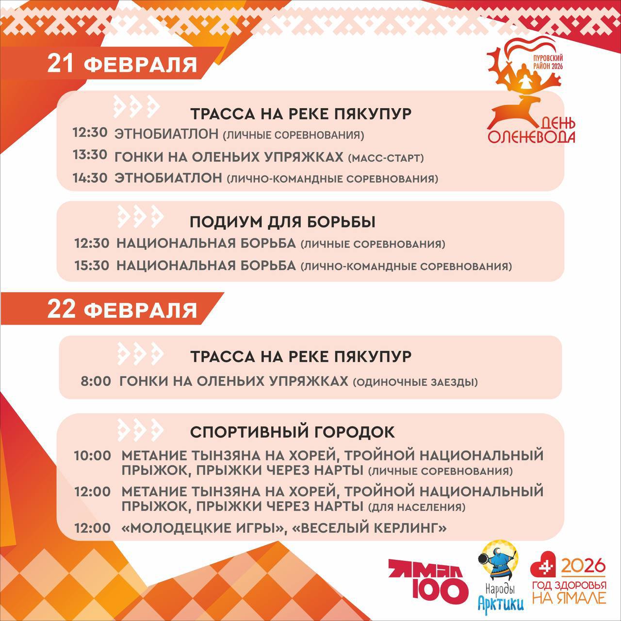 День оленевода в Пуровском районе пройдет 21 и 22 февраля. На берегу реки Пякупур дадут старт гонкам на оленьих упряжках, состоятся этнобиатлон, национальные прыжки, метание тынзяна, спортивные турниры. Отдельным событием станут показательные выступления парашютистов.