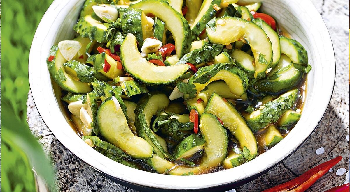 Шаг 2: В миске смешайте ломтики огурцов с чесноком, чили и зеленью. Влейте соевый соус, добавьте сладкий соус чили и тщательно перемешайте. Накройте и уберите в холодильник на 3 часа.