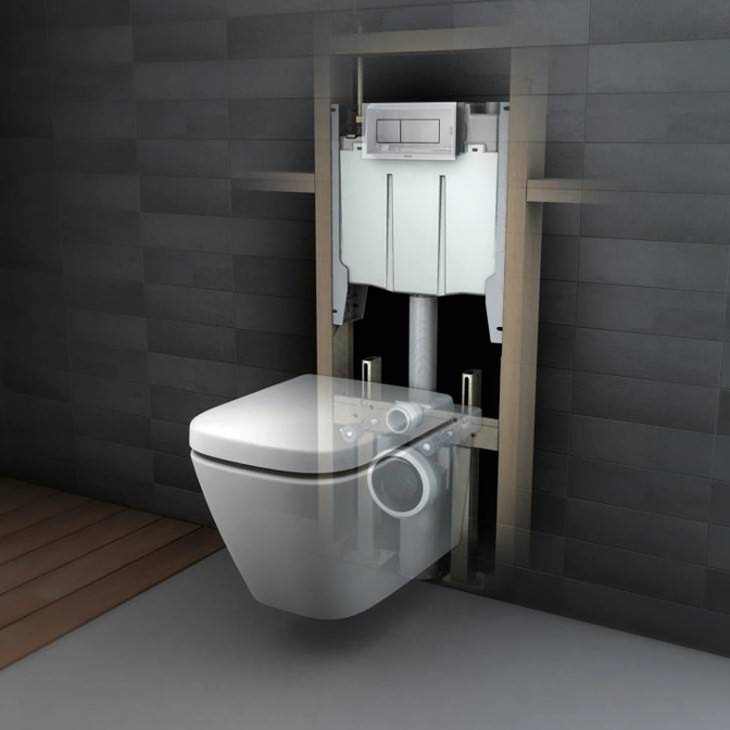 Рамная инсталляция — это более продвинутый и безопасный вариант. Эти конструкции оснащены прочным каркасом из нержавеющей стали с антикоррозийным покрытием, что позволяет им выдерживать нагрузки до 400 килограммов. В отличие от навесных, рамные инсталляции крепятся как к стене, так и к полу. Это обеспечивает равномерное распределение веса и позволяет устанавливать их на гипсокартонные перегородки или некапитальные стены, что дает больше гибкости в дизайне вашего санузла.