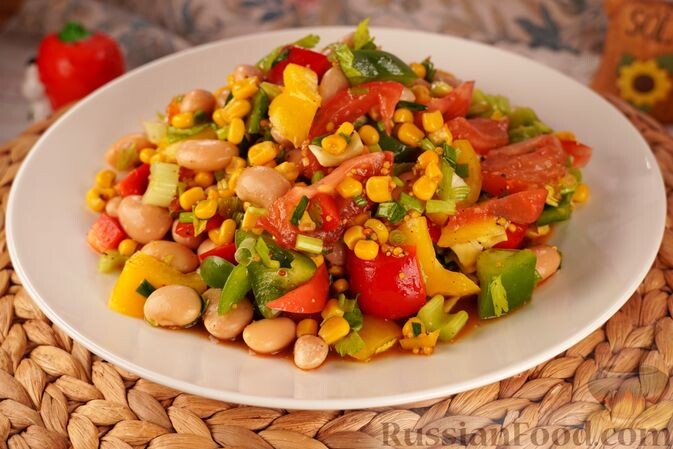 Салат с фасолью, кукурузой и сладким перцем привлекает внимание благодаря своему разнообразию и ярким цветам. Этот салат можно заправить смесью оливкового масла, лимонного сока и соевого соуса, что сделает его еще более интересным.