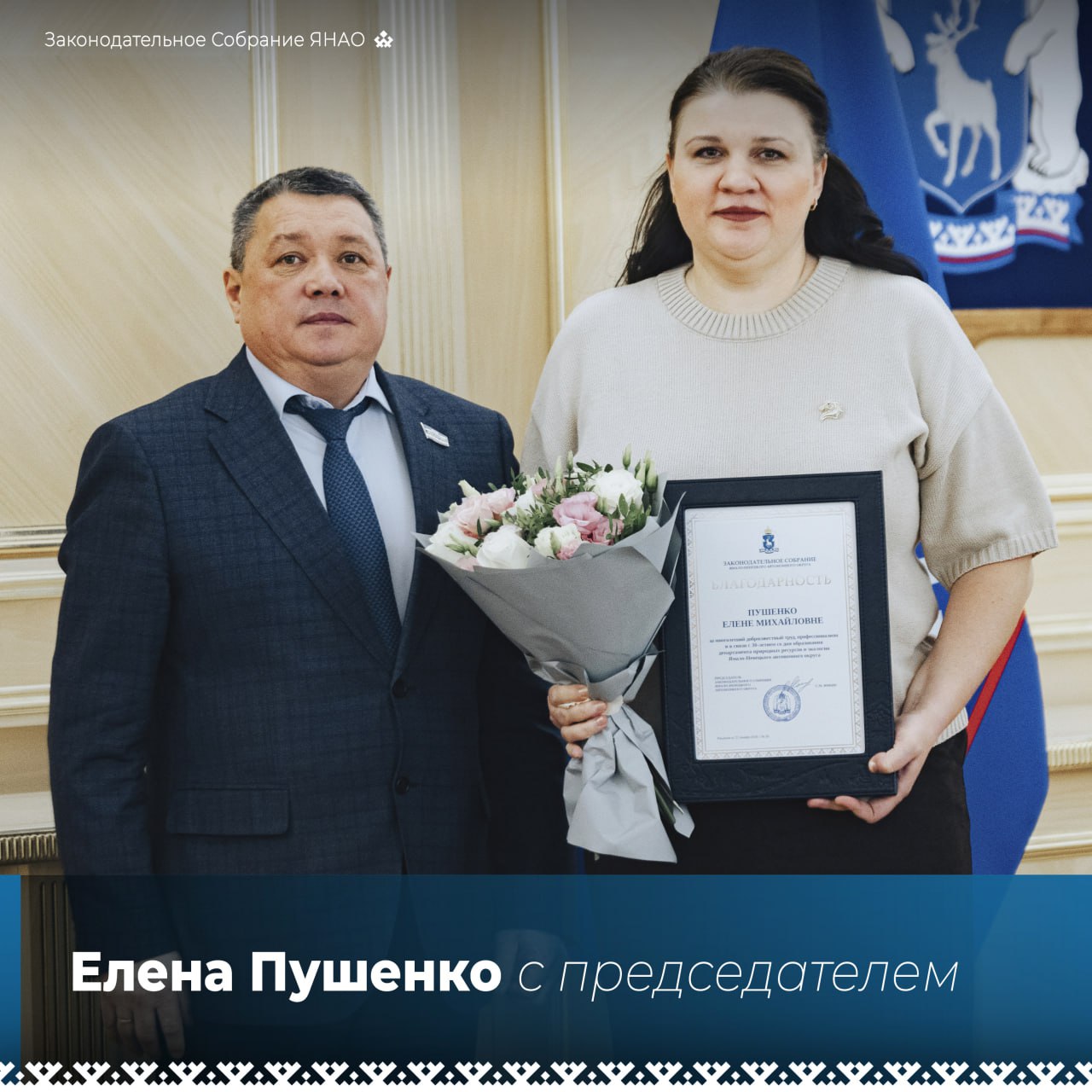 Председатель Сергей Ямкин вручил пять наград ямальского парламента сотрудникам департамента природных ресурсов и экологии. Поводом для чествования стал 30-летний юбилей ведомства