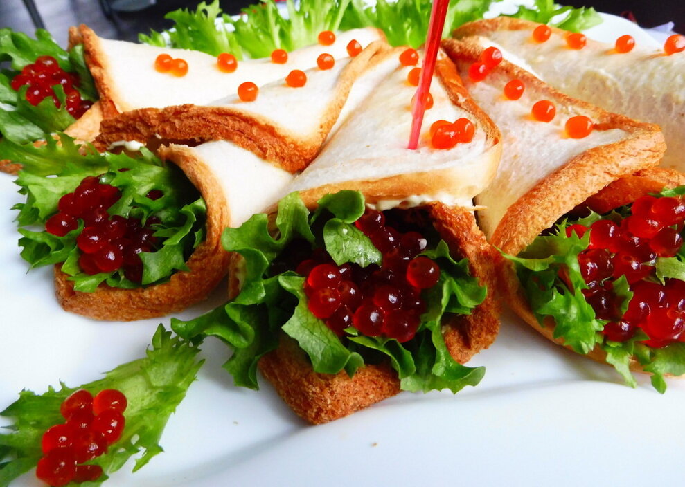 3. На один угол хлеба аккуратно уложить немного зеленого салата, затем свернуть в рулетик и добавить красную икру. Разнообразие и цветность придадут блюду даже другие виды икры, такие как черная.