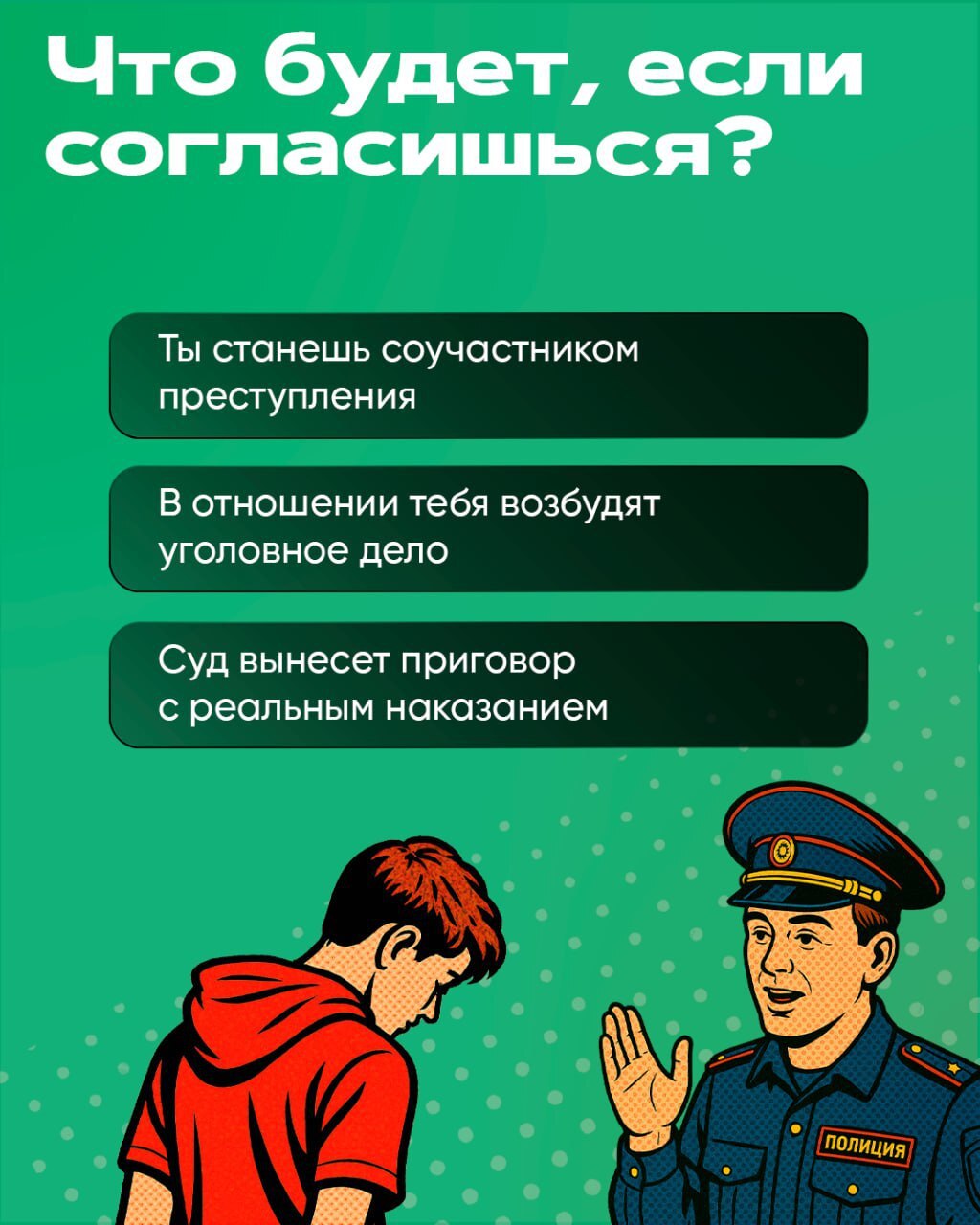 Это значит реальный тюремный срок и судимость, которая навсегда останется в биографии. Никакие обещанные суммы не стоят сломанной жизни.