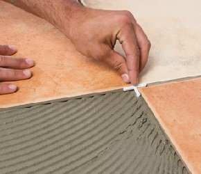 Позаботьтесь о ровном распределении плитки, периодически проверяя уровень. С помощью специальных крестиков создается необходимая текстура между плитками. При необходимости плитку подрезают, чтобы заполнить все пространство пола.