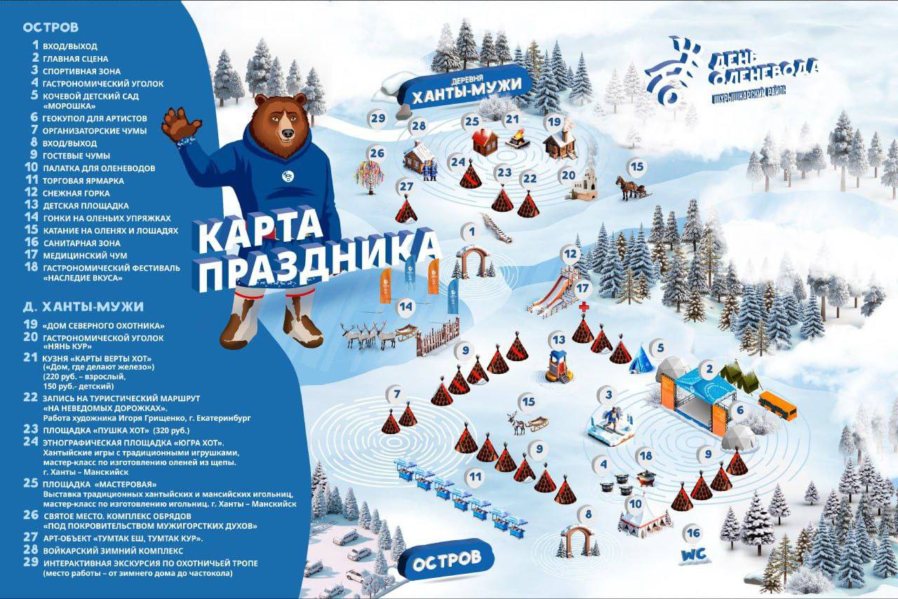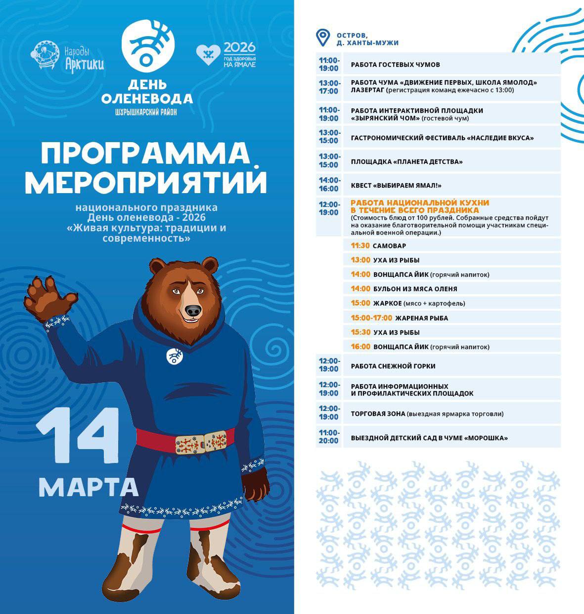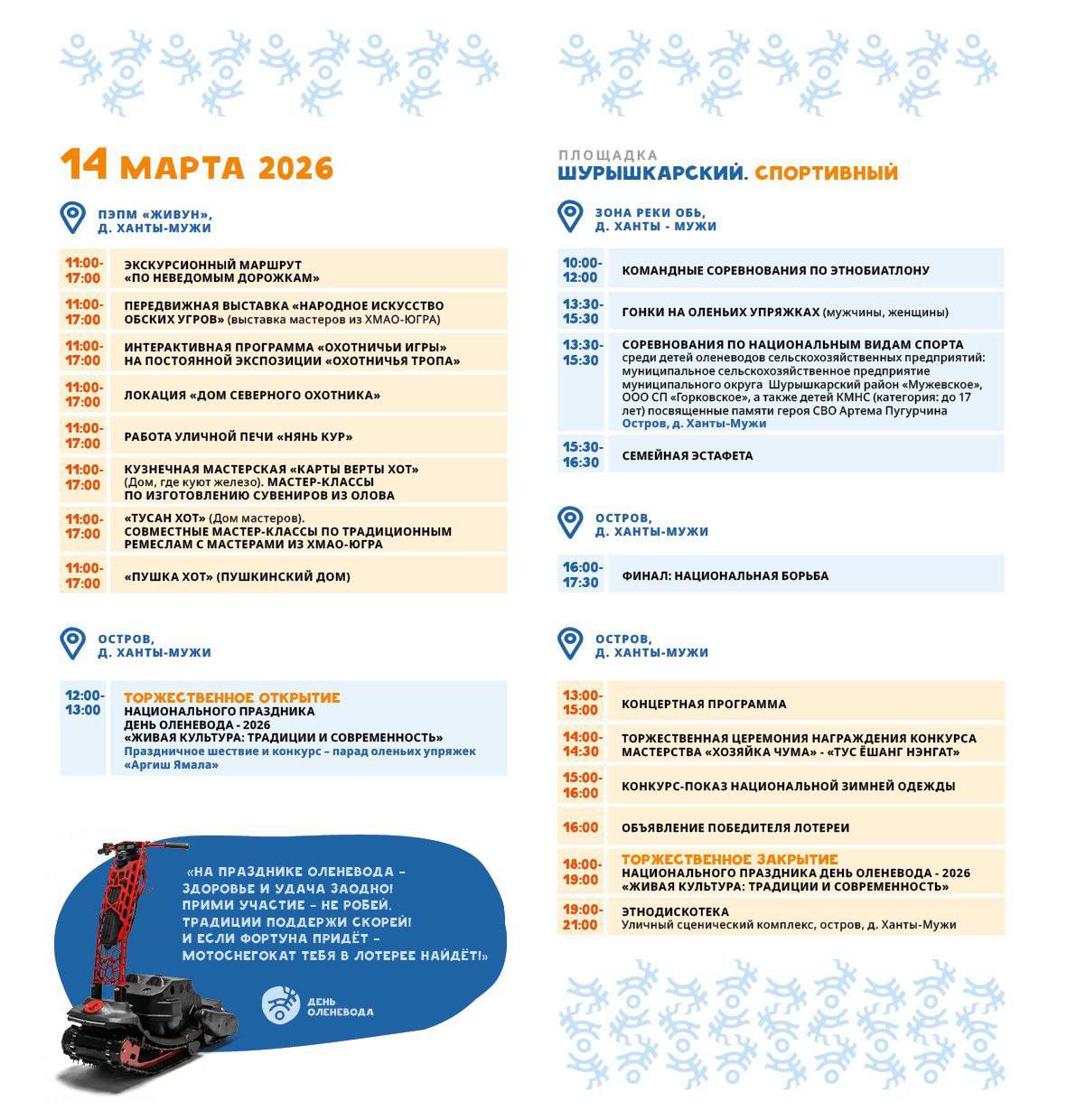 Для жителей и гостей района подготовили большую программу: 20 гостевых чумов, спортивные соревнования, фестиваль по строганию мяса и рыбы, мастер-классы, концертная программа и «мотоснегокатная» лотерея.