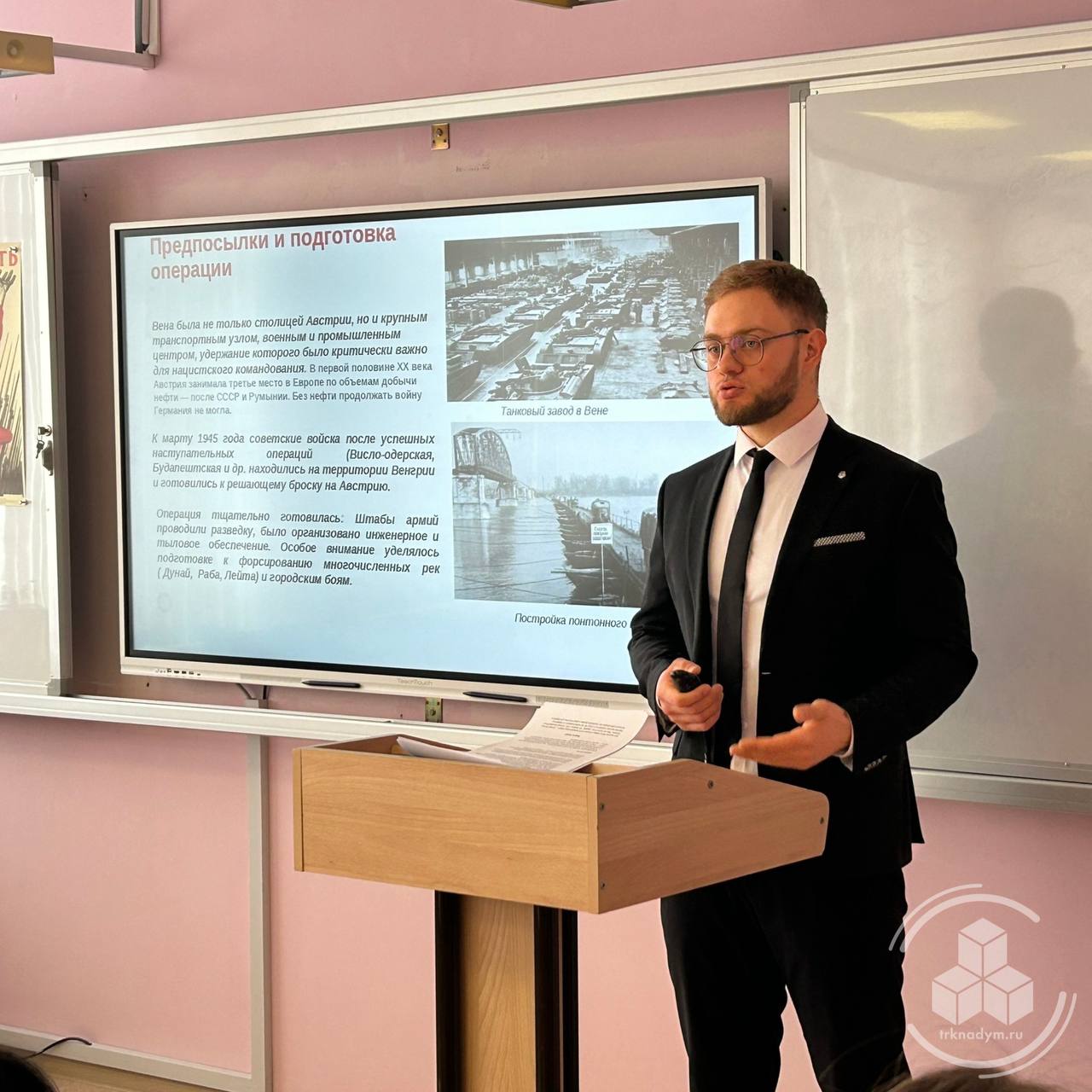 Учитель истории рассказал одиннадцатиклассникам о значении освобождения Австрии на заключительном этапе ВОВ: Австрия была важным промышленным центром нацистской Германии и родиной Гитлера, поэтому операция имела не только стратегическое, но и идеологическое значение. К тому моменту советские войска уже полностью освободили территорию СССР, а также Польшу и Венгрию, и взятие Вены приближало окончательный разгром врага.