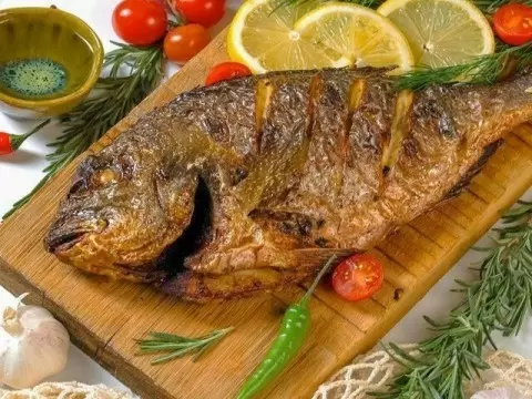 - Карп: Речная рыба, приготовленная на шпажках, сохраняет форму благодаря плотной коже и получает аппетитную корочку, оставаясь внутри нежной и слегка сладковатой.
