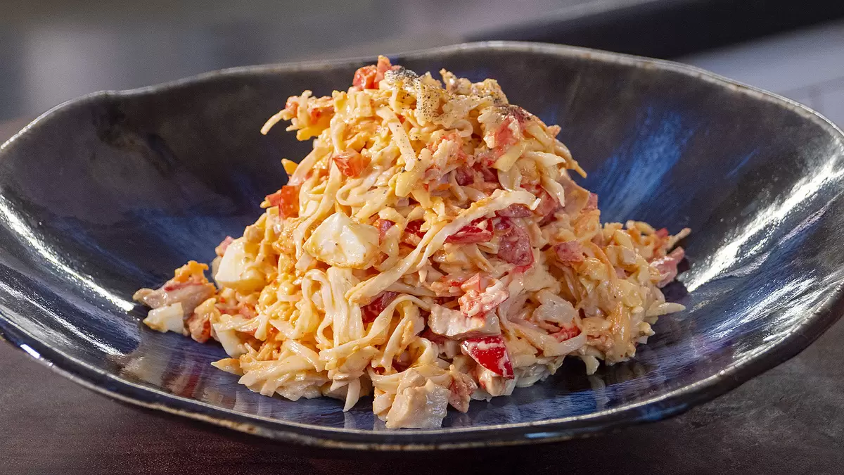 Приправить салат по вкусу: добавить соль, перец, долить немного соуса чили и хорошо перемешать с майонезом. Готовый салат следует выложить на сервировочную тарелку — он будет выглядеть ярко и аппетитно, а вкус приятно удивит любого!