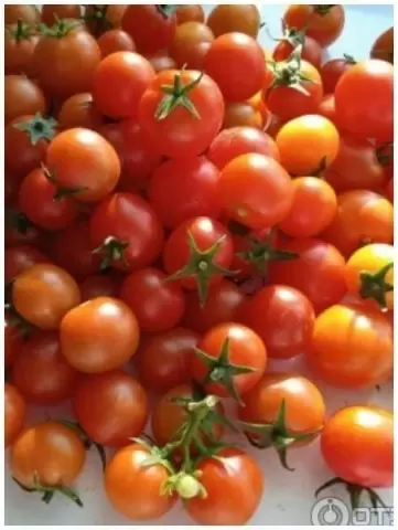 Плоды массой 10–15 грамм образуют длинные кисти, которые выглядят как гирлянда из маленьких сладких шариков. Вкус десертный и насыщенный, с легкой кислинкой, что делает их удачным дополнением к салатам и заготовкам.