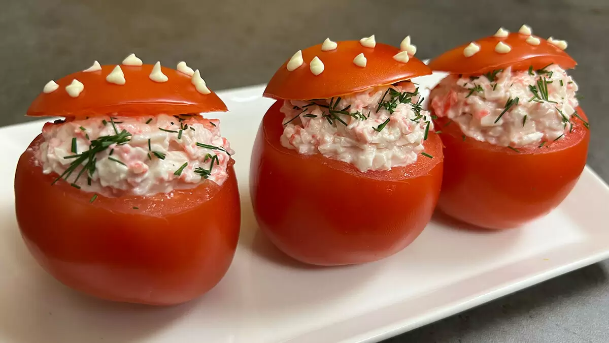 После этого добавьте творожный сыр и тщательно перемешайте массу до однородности. Полученную начинку следует аккуратно распределить по помидорам, которые теперь можно посыпать свежим укропом для аромата и красоты. Накройте каждый помидор шляпкой и добавьте несколько «точек» майонеза для декора. Вот и всё — закуска готова! Она не только приятна на вид, но и обладает пикантным вкусом, который обязательно привлечёт внимание ваших гостей.