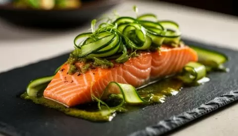 Татаки из лосося с соусом мисо-песто и цукини