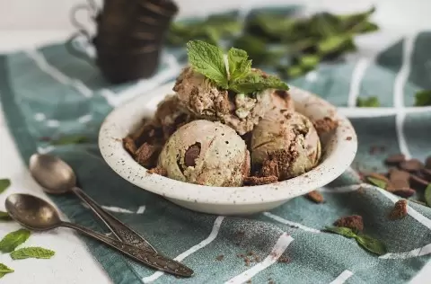 Шаг 5: В формы чередуйте мятную и шоколадную массы, можно слегка перемешать. Уберите в морозильник минимум на 2-3 часа. При подаче формируйте шарики из семифредо и украшайте свежей мятой.
