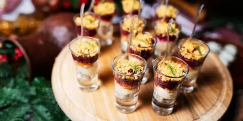 Это блюдо — настоящее произведение искусства. На дно бокала кладётся ложка икры, затем свекольный сорбет, пюре из сельди с картофелем и воздушный крем из сметаны с хреном. Украшается чипсом из морковной кожицы, что делает его не только вкусным, но и визуально привлекательным.