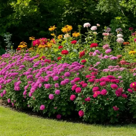 Для достижения гармонии в саду, сочетайте растения по высоте и срокам цветения. Например, на солнечном участке можно использовать следующую схему: