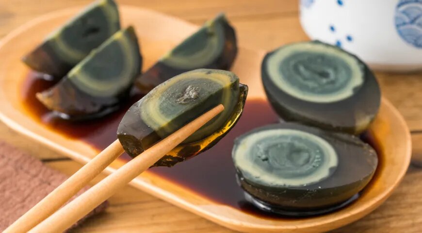 Столетние яйца, известные также как "тысячелетние" или "черные", представляют собой уникальную закуску, популярную в китайской кухне. Основу состава составляют утиные, куриные или перепелиные яйца, которые подвергаются процессу длительной выдержки в особой щелочной среде. Благодаря этому привычный вид яиц превращается: их белок становится полупрозрачным и темно-коричневым, а желток приобретает кремовую текстуру и зеленоватый оттенок. Декорированные узорами, похожими на сосновые ветви, некоторые из этих яиц удерживают статус более изысканных, получая название "яйца Сонхуа".
