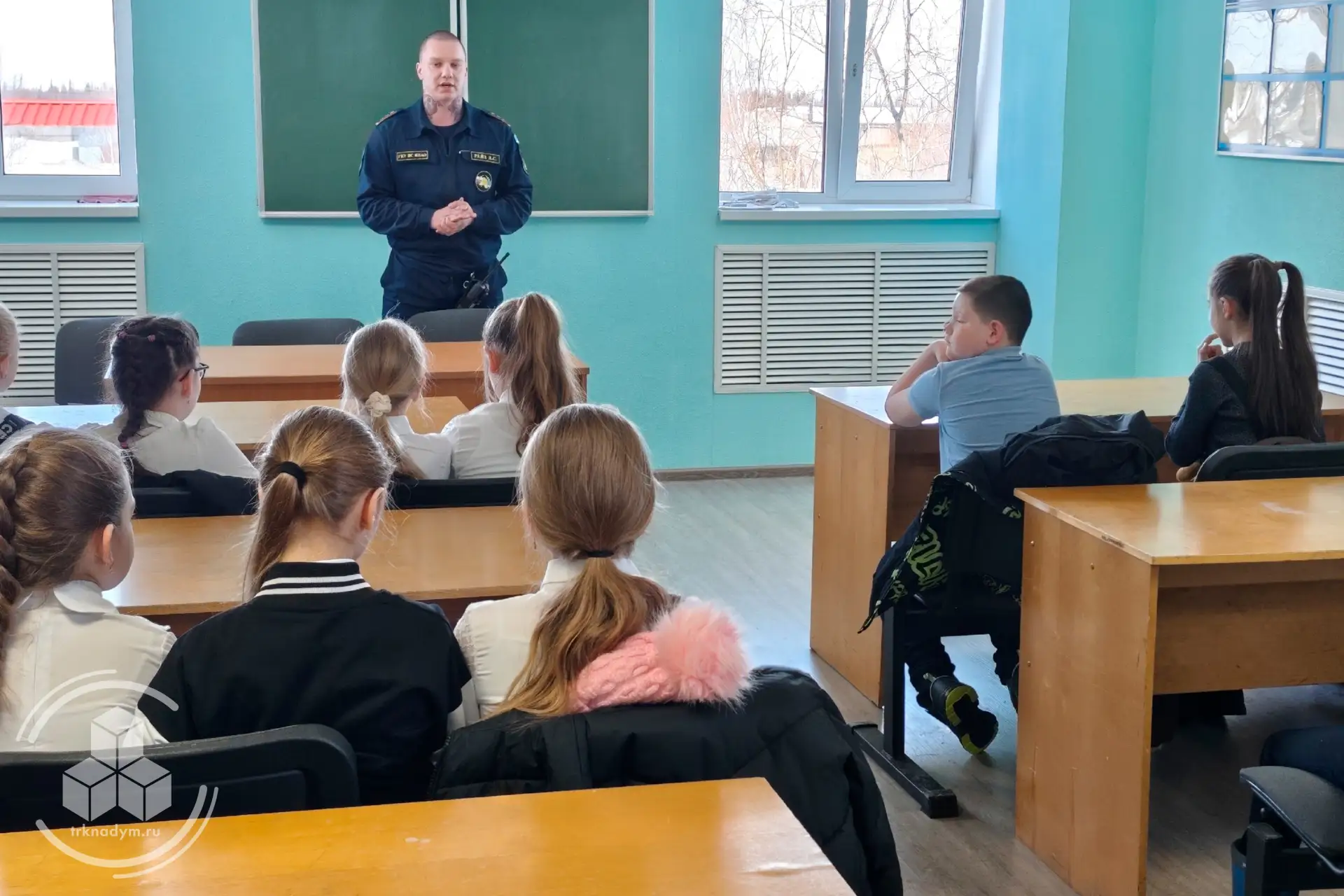 В аудитории, где личный состав изучает теорию, начальник ПЧ Дмитрий Рейз рассказал ребятам о людях, задача которых спасение людей и животных, материальных ценностей и личных вещей.