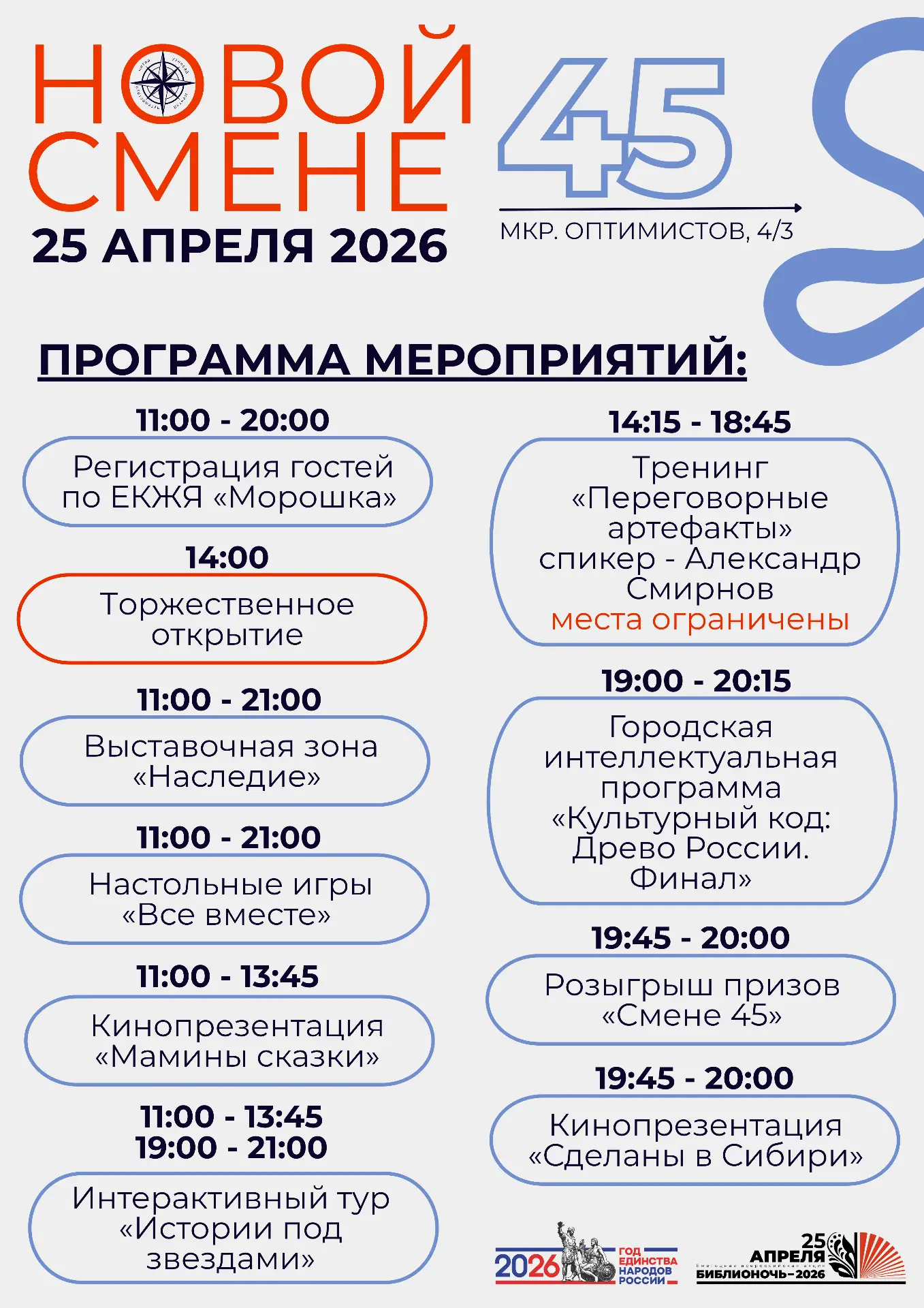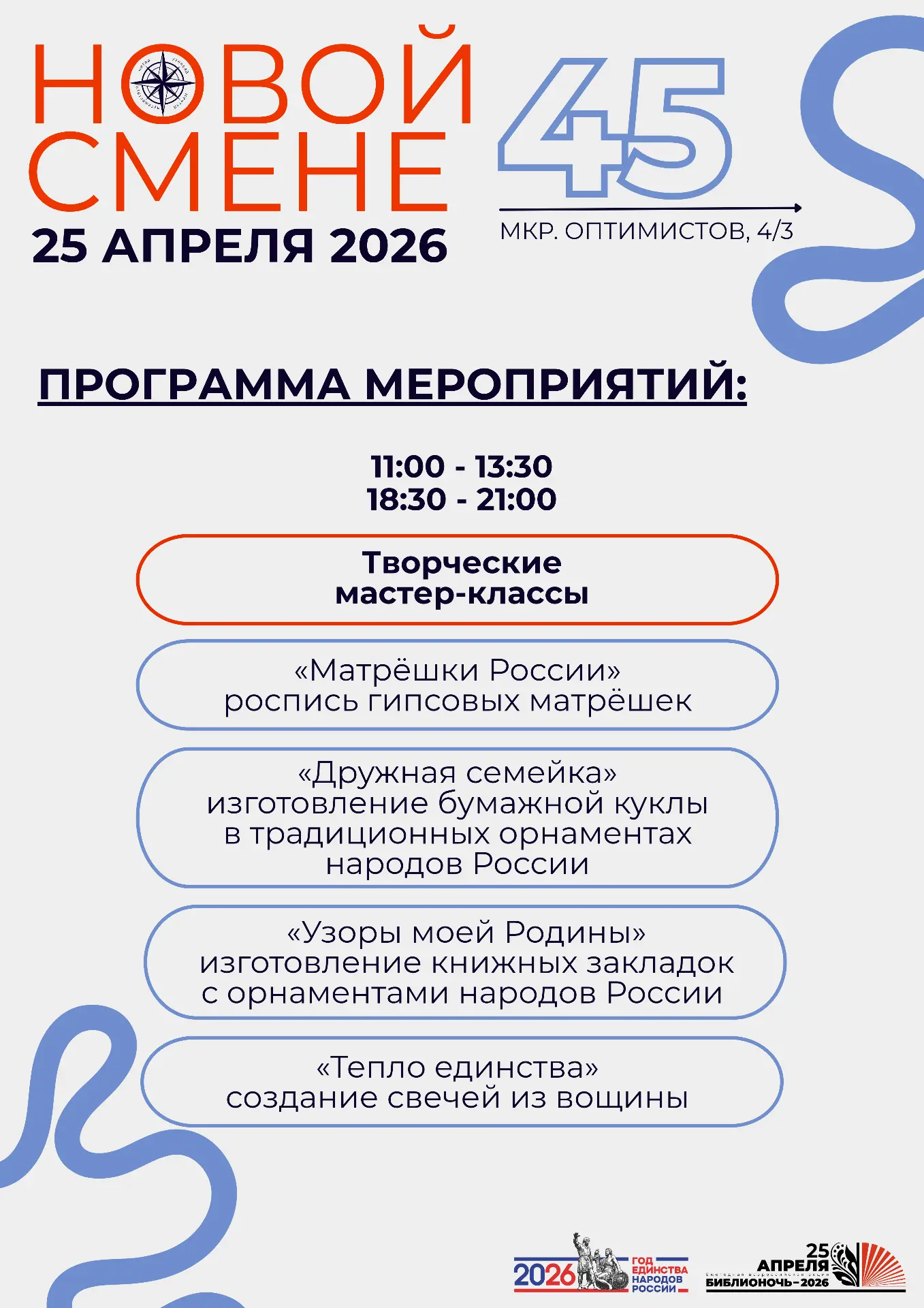 В этом году, в рамках Всероссийской акции «Библионочь», «Новая Смена» отметит своё 45-летие. Её залы превратятся в живую творческую площадку, где переплетаются судьбы, ремёсла и эрудиция.