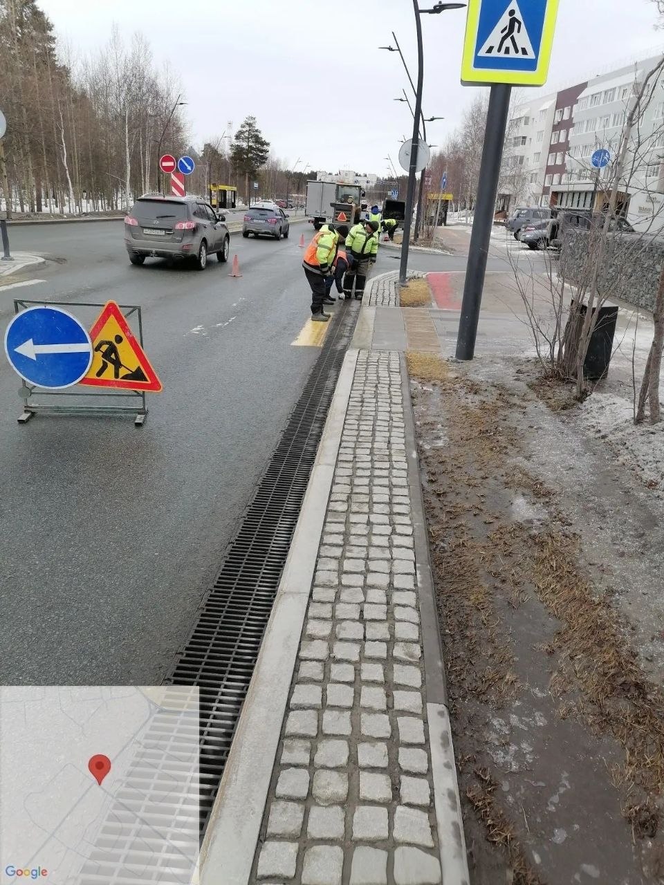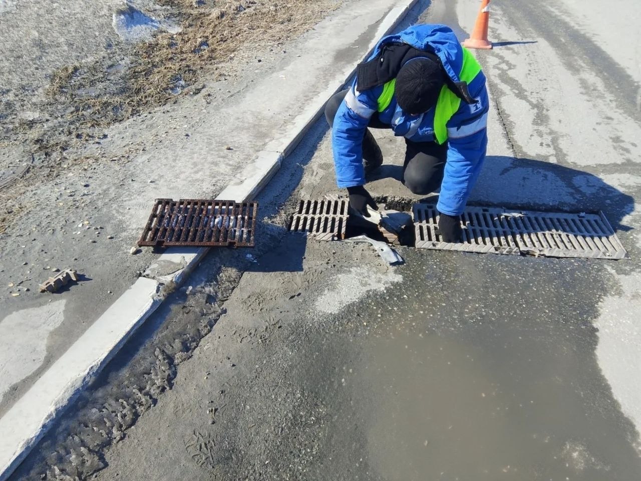 повторная очистка ливневых канализаций на улице Ленина возле комплекса «Фрегат» — туда активно стекает песок, который использовался для борьбы с гололёдом в зимний период.