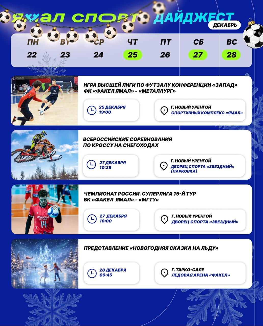 Нас ждет насыщенная спортивная неделя: соревнования, матчи и праздничные события. Провожаем уходящий год активно, поддерживаем спортсменов Ямала и встречаем Новый год в атмосфере спорта и движения!